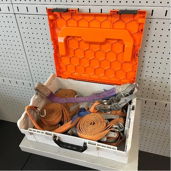 Koffer met spanbanden voor het vastzetten van bijvoorbeeld een minigraver op een aanhanger.