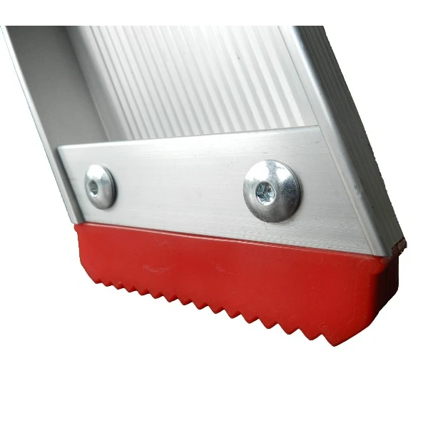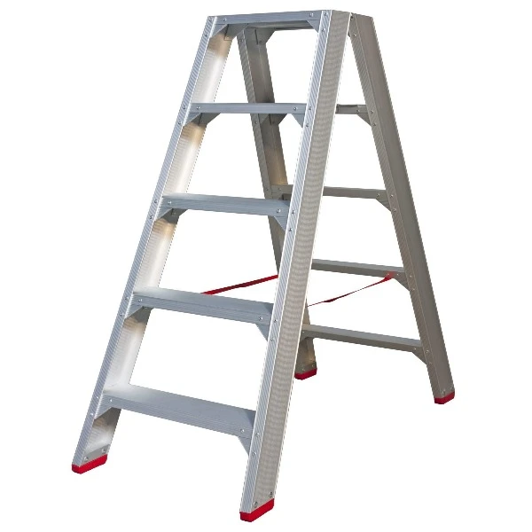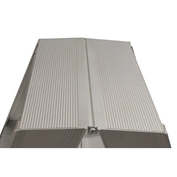 Oerdegelijke industrietrap met 4 schetsplaten en 12(!) popnagels in iedere trede. Het geanodiseerd aluminium is vuilafstotend en geeft niet af (geen vuile handen). De 10 cm diepe treden en het grote bordes zorgen voor een comfortabele werkplek. Bij de dubbel oploopbare trap is er een tweede stabordes dat als spreidbeveiliging fungeert. Vanaf 2×3 treden compleet geleverd inclusief verplichte steunbeugel (ARBO).