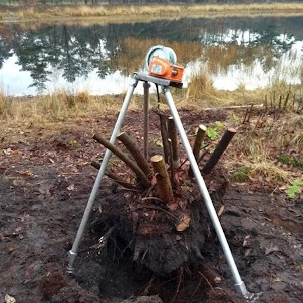 Nog geen 25kg zwaar, is hij makkelijk te vervoeren, een te verwijderen boompje krijgt dicht aan de grond een 'strop' omgebonden, door aan de lier te draaien, komt de boom omhoog, uiteindelijk ook zijn wortelstelsel. hij wordt bij andere op een hoop gegooid en zal nooit meer uitlopen.